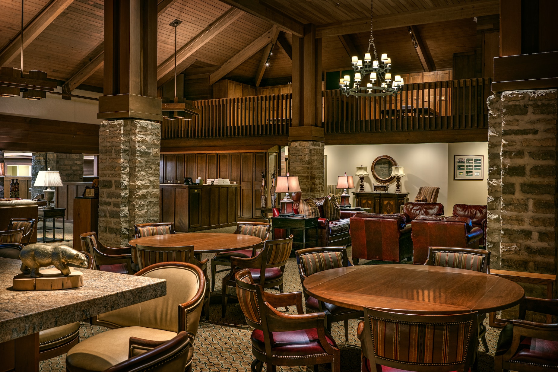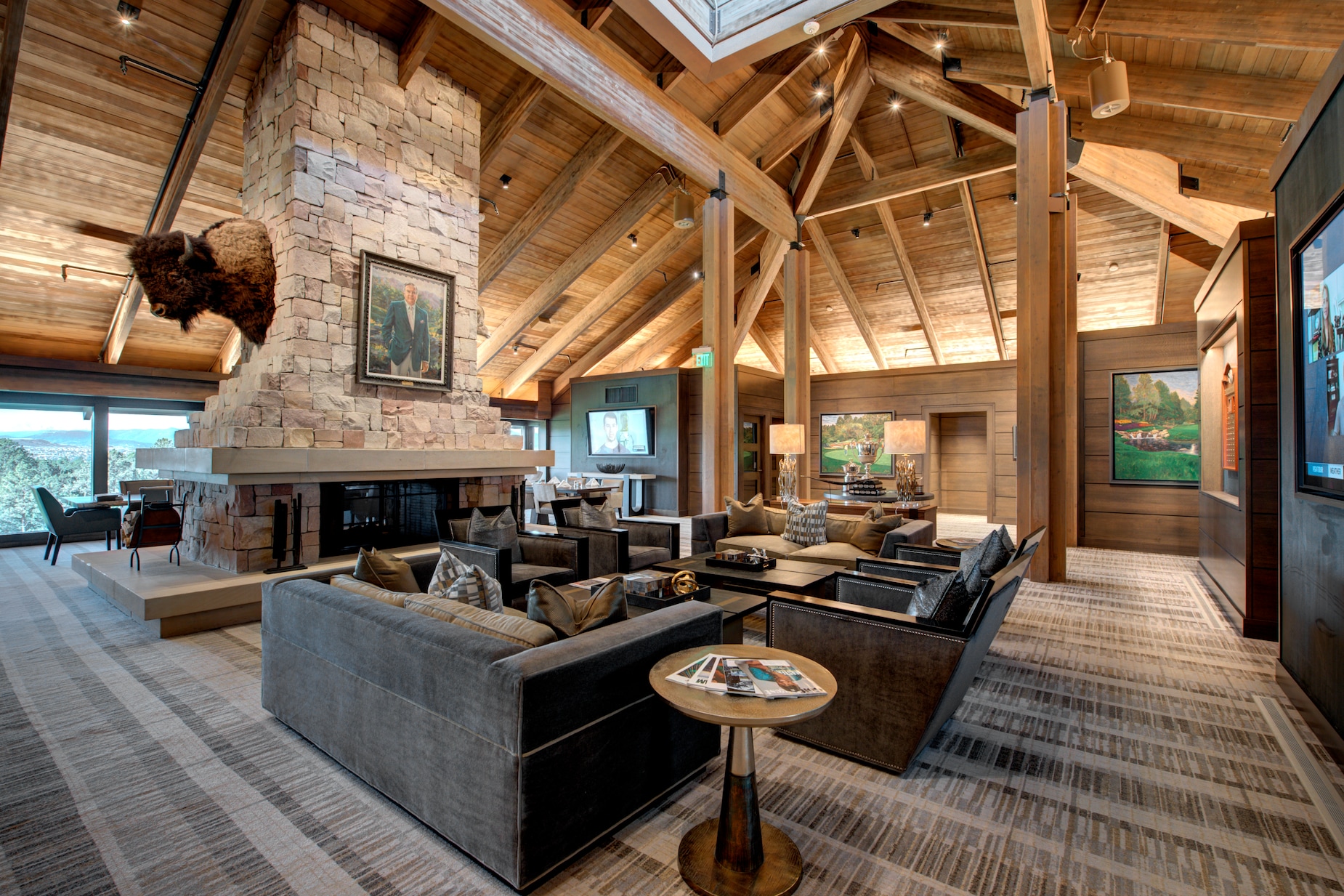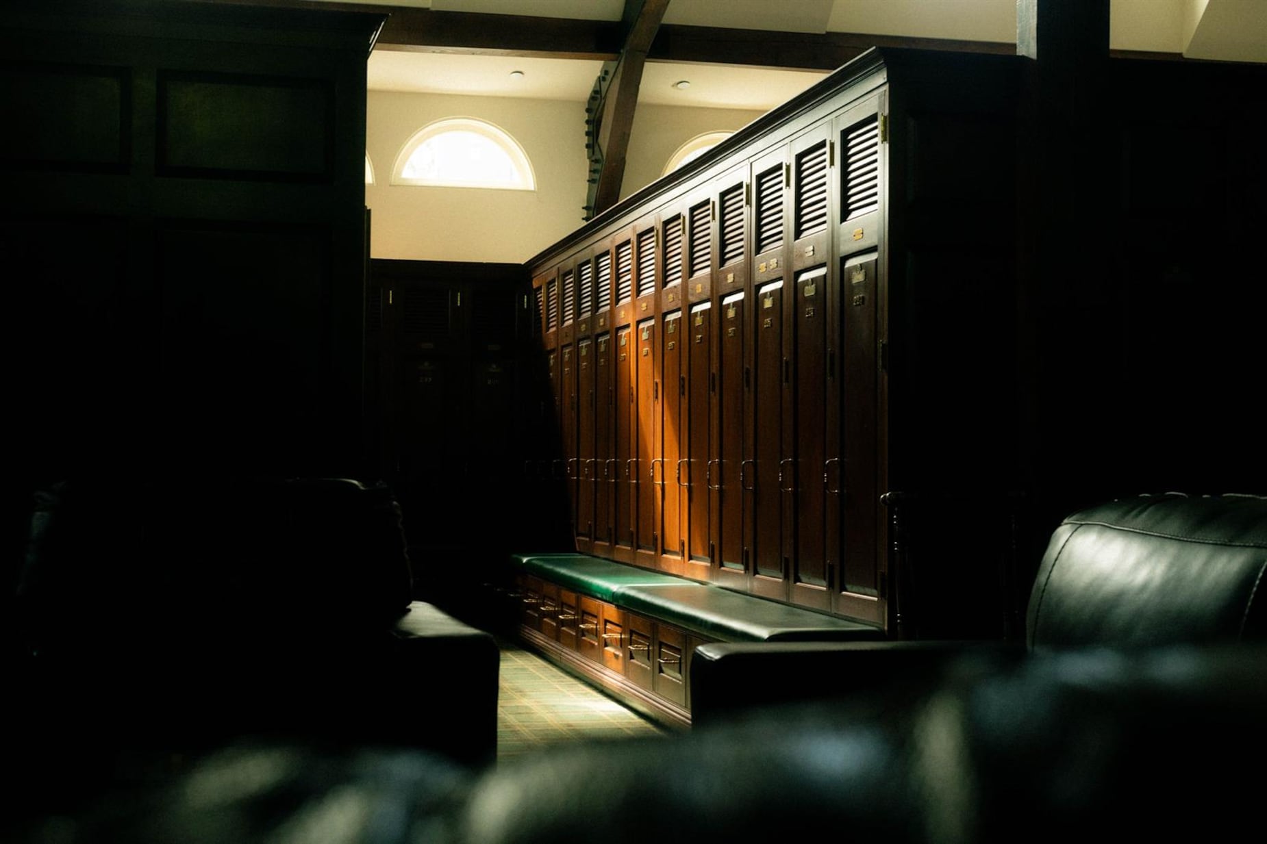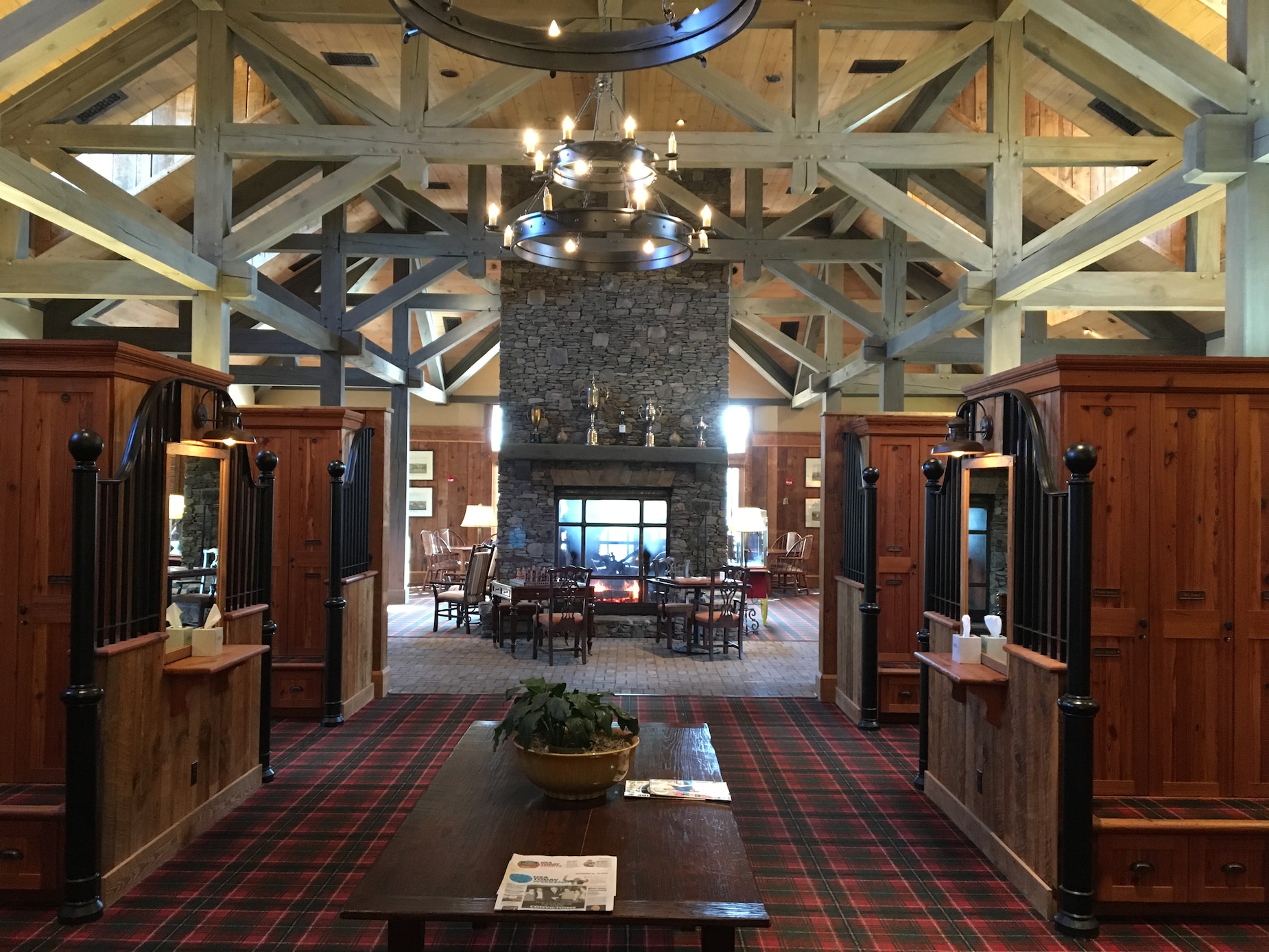 Bước vào đây giống như khám phá chuồng ngựa lộng lẫy nhất. Phòng thay đồ rộng 9,000 feet vuông với cửa ngăn kiểu chuồng riêng biệt và mái lợp ngói gỗ. "Thiết kế mô phỏng nhà kho cổ với quy mô ấn tượng," một chuyên gia chia sẻ. "Các chi tiết như dầm gỗ lộ thiên và tác phẩm nghệ thuật tạo nên không khí độc đáo. Cuối phòng là lò sưởi đá, quầy bar và những chiếc ghế da rộng rãi."