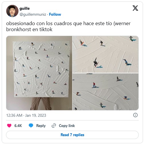 Với 1,3 triệu lượt thích và hơn 7 triệu lượt xem, bức tranh phong cảnh kết cấu DIY này từ tài khoản othen.art đẹp không kém gì câu chuyện đằng sau nó. Tác phẩm đã khắc họa một cách xuất sắc khoảnh khắc chiến tích bất ngờ ấy. Werner Bronkhorst, để bạn đọc dễ hình dung, là một nghệ sĩ đương đại người Úc nổi tiếng với phong cách "phông nền điêu khắc trừu tượng kết hợp với những hình người siêu thực thu nhỏ."