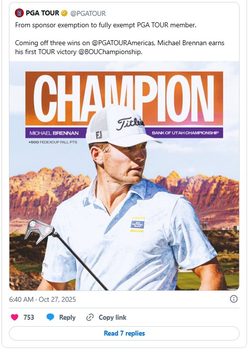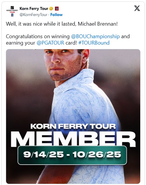 Phải thừa nhận là bóng bay xa hơn ở đây, và fairway rộng thênh thang, nhưng Brennan vẫn là người có chỉ số xuất phát tốt nhất (7.6) trên toàn PGA Tour trong năm. Đây là giải đấu PGA Tour duy nhất anh tham dự trong năm 2025, và cũng là lần đầu tiên anh thi đấu với tư cách golf thủ chuyên nghiệp. Thật phi thường! Anh giành vé đặc cách tham dự giải và vừa mới có thẻ chơi Korn Ferry Tour sau khi thống trị PGA Tour Americas. Và giờ đây, anh sẽ không cần phải thi đấu ở giải hạng dưới đó nữa - điều mà KFT đã ghi nhận một cách hài hước: