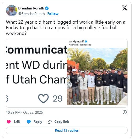 Chào mừng đến với chuyên mục tuần này, nơi chúng tôi vẫn đang ngây ngất sau một tuần thi đấu golf đầy ấn tượng. Tôi đã chứng kiến cựu sinh viên Đại học Wake Forest, Michael Brennan (tốt nghiệp năm 2024 – sau tôi hai thập kỷ… già thật rồi!), thống trị Giải Vô địch Bank of Utah để giành danh hiệu PGA Tour đầu tiên.