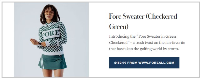 Ra đời từ tâm huyết của hai nữ doanh nhân Jen Clyde và Michelle Money, Fore All hướng đến mục tiêu xây dựng cộng đồng phụ nữ yêu golf thông qua các hoạt động kết nối, chia sẻ kinh nghiệm và đề cao giá trị đích thực. Những nỗ lực này đã được ghi nhận khi bộ sưu tập của họ vinh dự nhận giải “Best Dressed” và “Best Women’s Brand” tại PGA Show Fashion 2024.