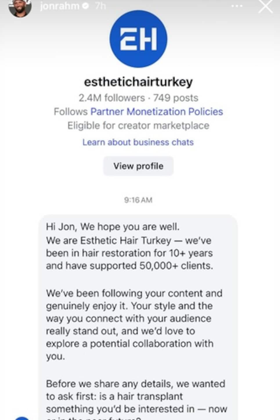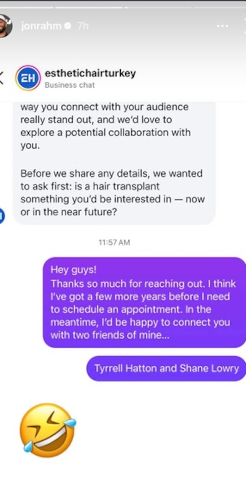 Hôm thứ Năm, Rahm tiết lộ một đề nghị khá thú vị mà anh nhận được từ một công ty cấy tóc Thổ Nhĩ Kỳ. Chuyện bắt đầu khi Esthetic Hair Turkey gửi tin nhắn trực tiếp đến nhà vô địch hai lần major này.