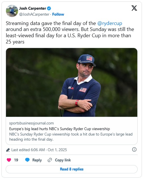 Dù phía Mỹ có khởi đầu ấn tượng vào sáng Chủ nhật, đỉnh điểm lượt xem chỉ chạm mốc 5.3 triệu trong khung giờ 5:00-5:15 ET. Kết quả cuối cùng, châu Âu bảo vệ thành công chiếc cúp với tỷ số 15-13.