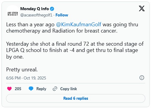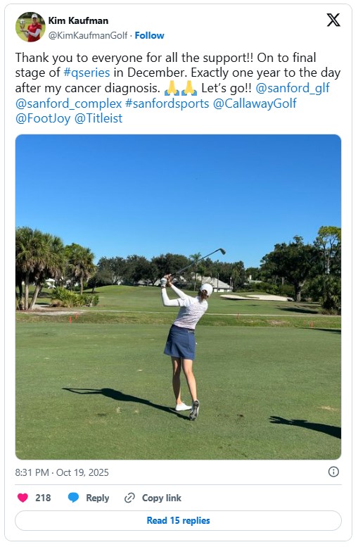 Kim Kaufman: Tại sao chúng tôi lại chú ý đến một người vượt qua vòng loại cuối cùng của LPGA Q School? Bởi vì đây quả là một năm đáng nhớ với Kaufman, người được chẩn đoán mắc ung thư vú đúng một năm trước màn trình diễn xuất sắc của cô vào Chủ nhật để tiến bước.