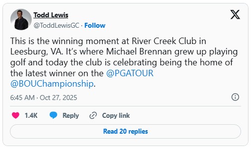 Sân golf River Creek Club tại Leesburg, Virginia chật kín người đến theo dõi người con của làng - Michael Brennan, giành danh hiệu PGA Tour đầu tiên trong sự nghiệp.