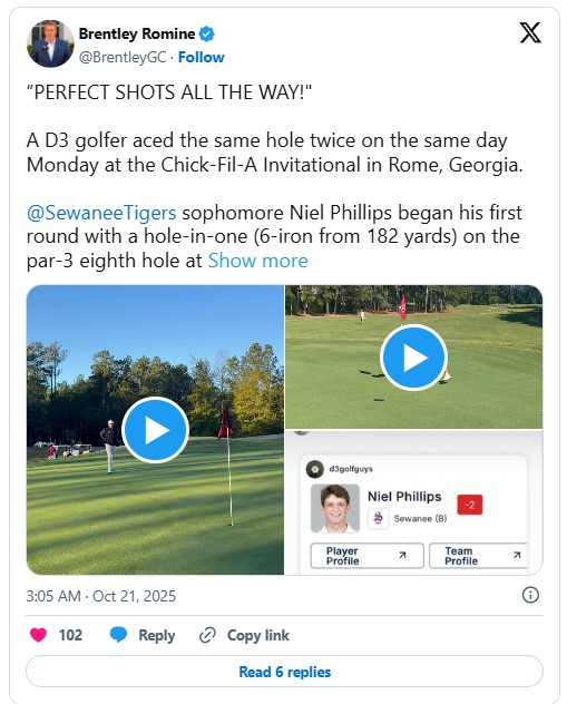 Sáng thứ Hai, vào lúc 8:30, Niel Phillips (sinh viên năm hai, đội golf Sewanee) bước lên bệ phát bóng hố 8 (par-3) trong giải Chick-Fil-A Invitational tại Rome, Georgia. Đây là cú đánh đầu tiên trong ngày của anh. Bất chấp thời tiết lạnh và ẩm ướt, anh thực hiện một cú đánh "hoàn hảo". Trái bóng bay thẳng và rơi xuống đáy lỗ ngay lập tức. Đó là cú hole-in-one đầu tiên.