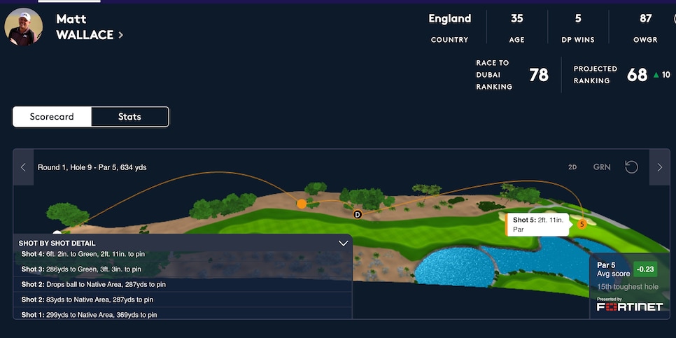 Từng là nhà vô địch PGA Tour, Wallace rơi vào thế khó ở hố 9 par-5 của Câu lạc bộ Golf Doha sau cú drive bị hook sang trái vào khu vực tự nhiên. Sau khi chịu phạt drop bóng, tình thế vẫn chưa sáng sủa hơn – đúng nghĩa "mắc kẹt" giữa sa mạc.